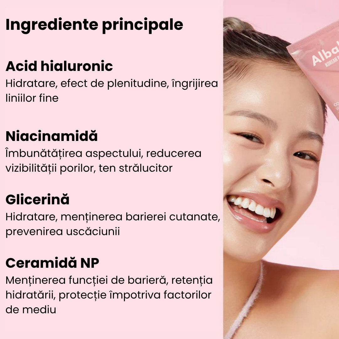 - Acid hialuronic (hialuronat de sodiu) Hidratare intensă care umple pielea și reduce liniile fine.